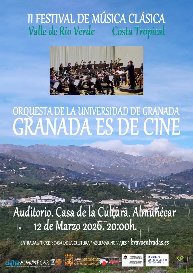 The University of Granada Orchestra will bring the 2nd Valle de Río Verde Classical Music Festival to a close with a grand concert in Almuñécar, under the theme “Granada is Film Music.” The program will feature pieces from films shot in the Province of Granada, accompanied by a projection of images from these films.